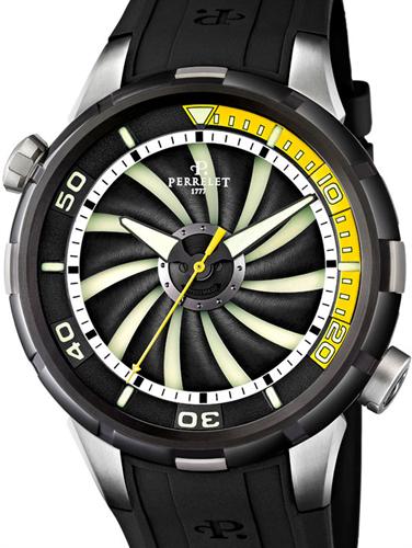Black and yellow, luminous under-dial beneath the black Turbine (11 titanium blades), luminous Arabic numerals and hour-markers.