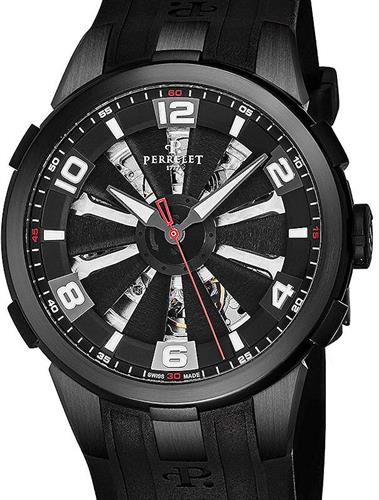 Black steel with PVD coated 44mm case A1081/1 Skeleton Turbine model. The double rotor, transformed for the occasion into a turbine fitted with 10 blades, covers the skeleton dial.