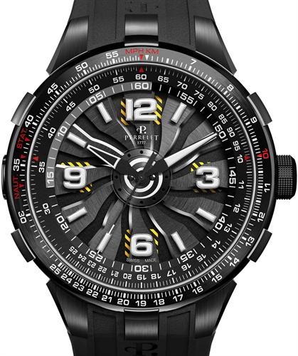 Perrelet Turbine Pilot watch model A1086/1. Stainless steel black PVD plated 48mm case with observation back. 12 titanium blades on Turbine dial. Luminous Arabic numerals and hour-markers. Black rubber band