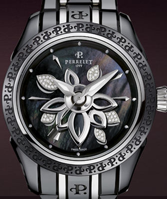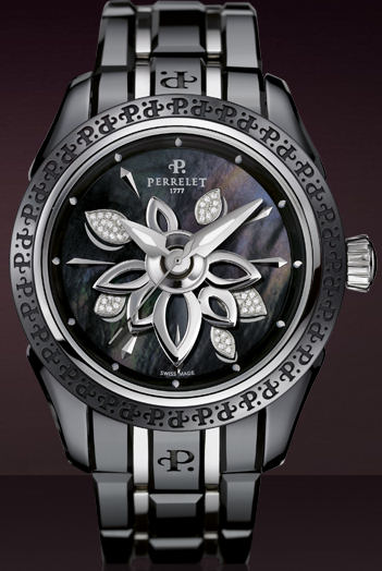 Perrelet`s bewitching watchmakers jewellery collection "Black Diamond Flower" decks itself out in polished black ceramic. Atop black mother-of-pearl 54 diamonds (0.081 carat) encrusted dial, connected and perfectly synchronized with the oscillating weight, the lotus flower generates additional energy for the winding mechanism of the Swiss made ETA2892A2 movement.