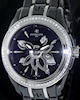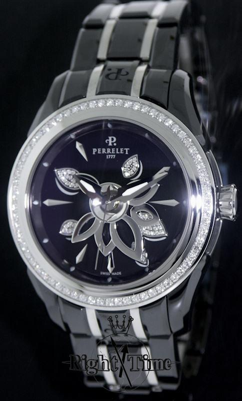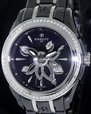 Perrelet`s bewitching watchmakers jewellery collection "Black Diamond Flower" decks itself out in polished black ceramic. Atop black mother-of-pearl 54 diamonds (0.081 carat) encrusted dial, connected and perfectly synchronized with the oscillating weight, the lotus flower generates additional energy for the winding mechanism of the Swiss made ETA2892A2 movement. Total of 189 diamonds, almost 1.5 carats, adorns this beautiful "black tulip".