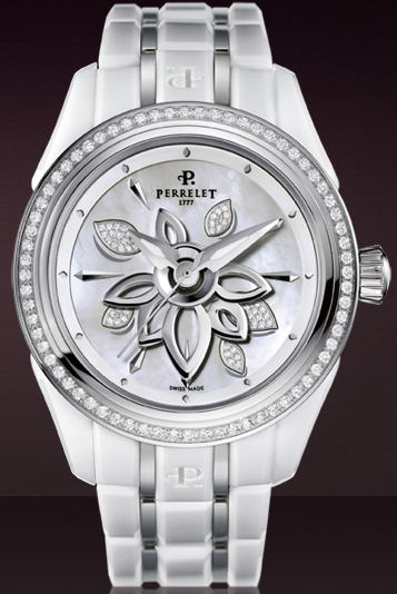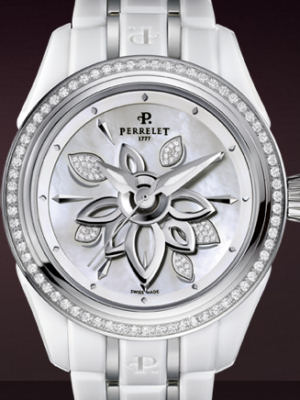 Perrelet`s bewitching watchmakers jewellery collection "Diamond Flower" decks itself out in polished white ceramic. Atop white mother-of-pearl diamond encrusted dial, connected and perfectly synchronized with the oscillating weight, the lotus flower generates additional energy for the winding mechanism of the Swiss made ETA2892A2 movement. Total of 189 diamonds, almost 1.5 carats, adorns this beautiful "flower".