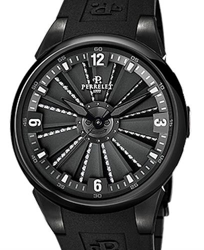 Perrelet Turbine XXS A2057/A model inside steel black PVD coated case with diamonds under black dial. The double rotor, transformed for the occasion into a turbine fitted with 12 blades
