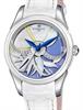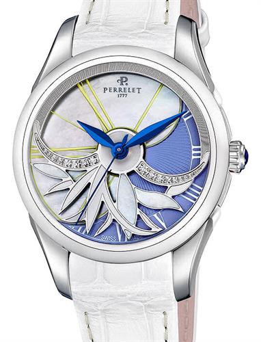 Perrelet First Class Lady Diamond Flower Amytis watch model A2065/6 powered by automatic in-house manufactured P-181 movement. Gorgeous, white Mother-of-Pearl and blue Sunburst Guilloche textures dial with petal shaped diamond-set double rotor. Stainless steel round case with white leather strap