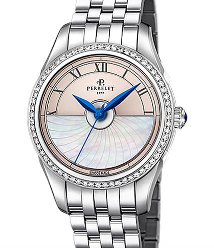 Perrelet First Class Lady Diamond Flower Amytis watch model A2066/8 powered by automatic in-house manufactured P-181 movement. Contrasting champagne with Roman numerals dial and white Mother-of-Pearl "flower" double-rotor. Stainless steel round case with hand set diamond bezel and bracelet