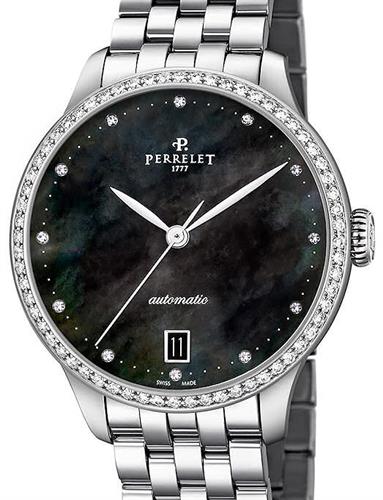 Perrelet First Class Lady watch model A2070/8 powered by automatic in-house manufactured P-321 movement. Gorgeous black Mother-of-Pearl dial with 12 diamond markers. Stainless steel round case decorated with 62 diamond bezel. Total weight of 74 Top Wesselton diamonds is 0.95 ct.