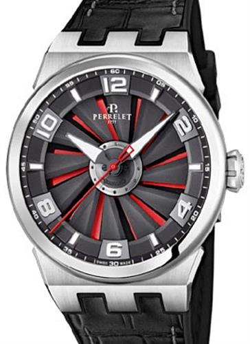 Perrelet Turbine Evo model from Perrelet Turbine Collection. Rotating 12 bladed turbine reveals a red under-dial when it spins at full speed. Stainless steel case. Black rubber and leather strap