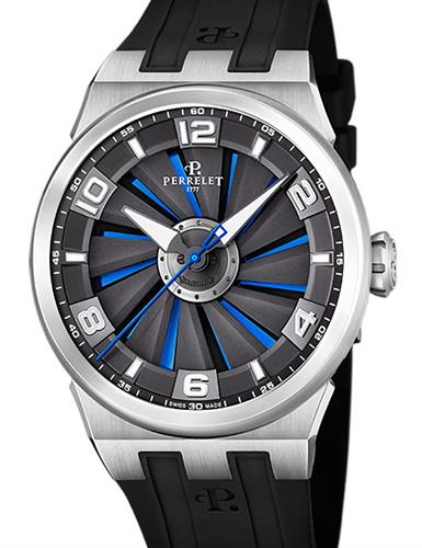 Perrelet Turbine Evo model from Perrelet Turbine Collection. Rotating 12 bladed turbine reveals a blue under-dial when it spins at full speed. Stainless steel case. Black rubber strap