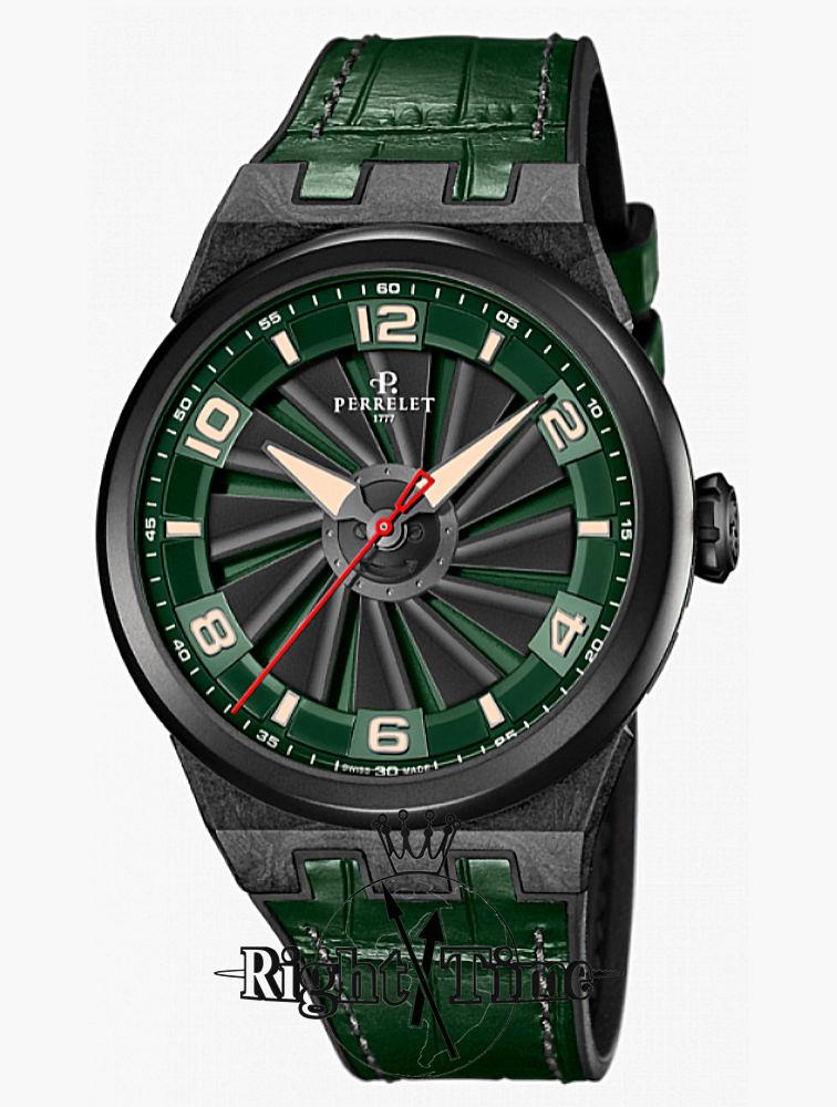 Perrelet Turbine Carbon Forest Green model A4065/4 from Perrelet Turbine Collection. Rotating 12 bladed turbine reveals a green under-dial when it spins at full speed. Black polycarbonate and carbon fiber case. Green leather strap