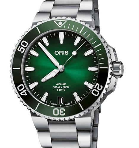 Oris Aquis Diver model 01 400 7769 4157-07 8 22 09PEB. Powered by the phenomenal Oris Caliber 400 automatic movement. Made in house by Oris in Switzerland, this new movement has 21 jewels and a massive 5 day power reserve. The movement is housed in a stainless steel case on a bracelet. Vibrant green dial with luminous hands and markers. Green color ceramic uni-directional bezel. Sapphire scratch resistant crystal. Water resistant to 300 meters.