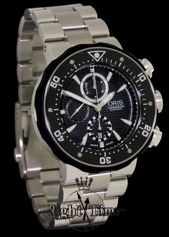 Oris ProDivers 1000m 0167476307154 water resistant Swiss automatic chronograph with Helium Valve. Large 51mm case. All solid titanium case and band (and comes with an extra rubber strap), black dial with luminous markers, solid titanium case back. Rotating bezel with proprietary safety system.