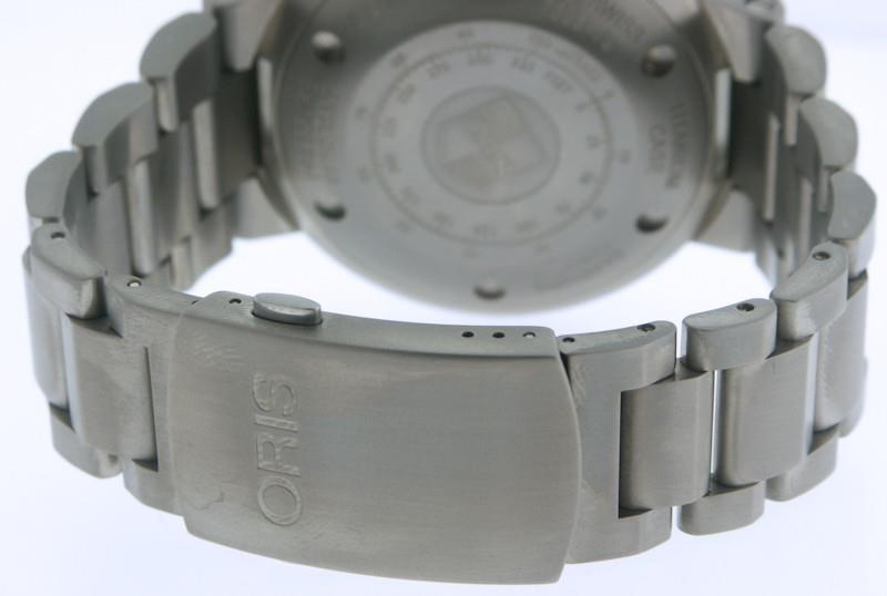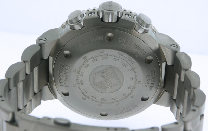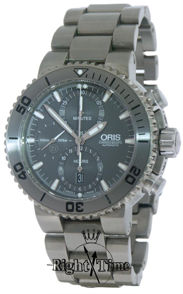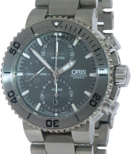 Oris Aquis Titanium diver model 01 674 7655 7253. Diver rated to 500meters. Swiss made Oris Caliber 674 automatic chronograph. Solid titanium case and bracelet. Uni-directional bezel with 60 minutes tungsten insert. Grey dial with luminous hands and markers.