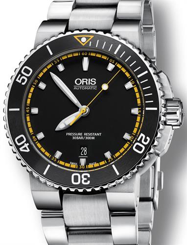 Oris Aquis Divers model 01 733 7653 4127. Swiss made Oris Caliber 733-1 automatic movement. Black dial with yellow color chapter ring. Sapphire crystal with interior anti-glare coating. Stainless steel case and bracelet. Uni-directional diver bezel with black color ceramic insert.