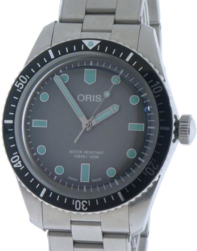 Oris Diver Sixty-Five model 0173377074053-0782018. Solid stainless steel case. Grey dial with teal color luminous markers. Powered by an automatic movement based on the SW200 with 26 jewels. Black uni-directional bezel with 60 minute markers. Comes on bracelet.