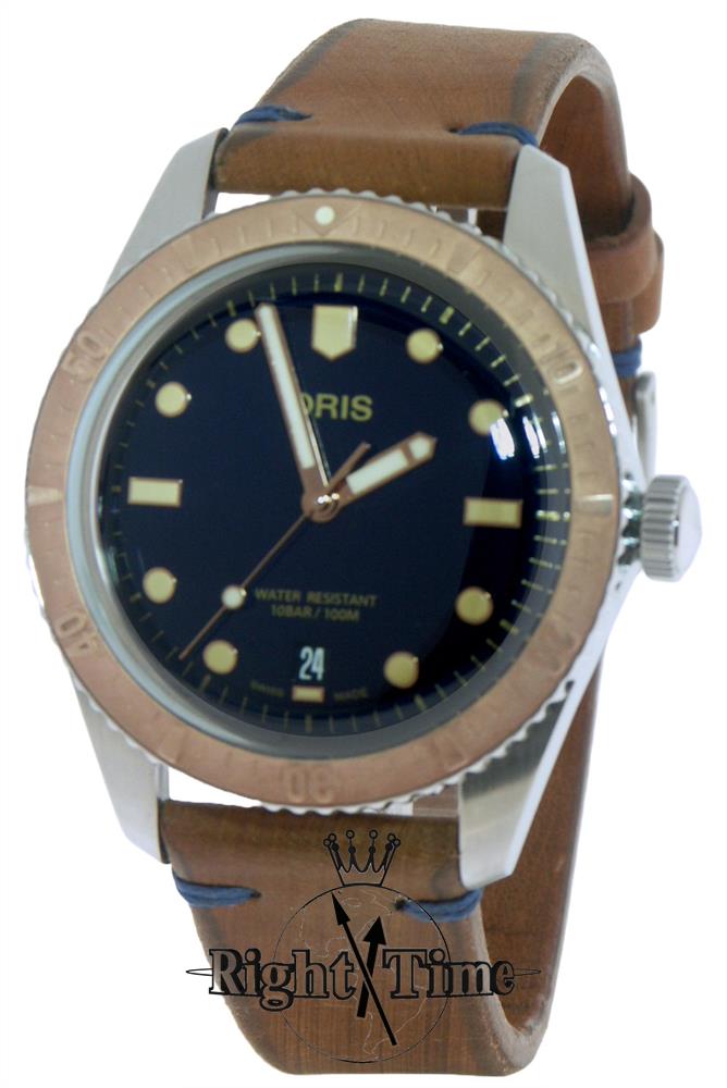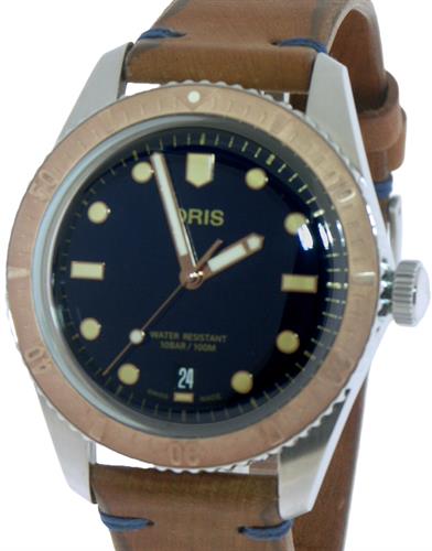 Modeled after its original 1960`s counterpart is the Oris Sixty-Five Diver 01 733 7707 4355. Replicates the look and feel of the original, but with modern parts and techniques. Solid stainless steel case with bronze bezel. Blue dial. Sapphire crystal. Powered by an automatic movement based on the SW200 with 26 jewels. Comes on a brown leather strap with tang style buckle.