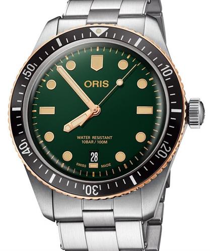 Modeled after its original 1960`s counterpart is the Oris Sixty-Five Diver 0173377074357-0782018. Replicates the look and feel of the original, but with modern parts and techniques. Solid stainless steel case with black bronze bezel. Green dial. Sapphire crystal. Powered by an automatic movement based on the SW200 with 26 jewels. Comes on a metal bracelet.