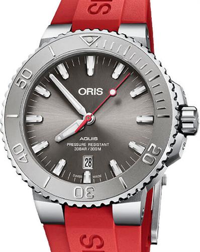 Oris Aquis Divers wrist watch 01 733 7730 4153-07 4 24 66EB 300m Water resistant. Swiss Automatic movement, 43.5mm stainless steel case with grey ceramic uni-directional 0-60 rotating bezel, screw-down crown, grey dial with luminous hands and markers, date calendar, sapphire anti-reflective scratch-proof crystal, red rubber band.