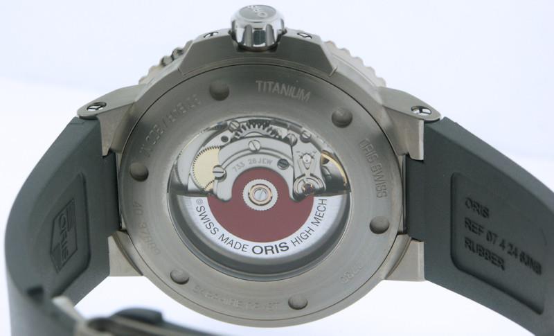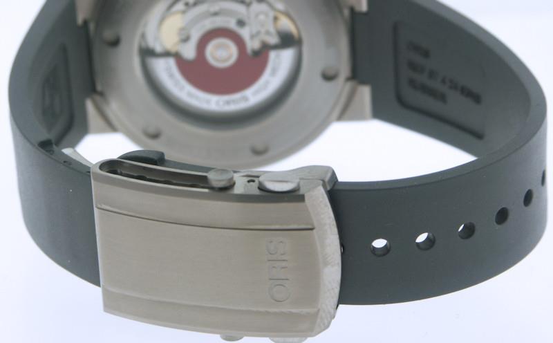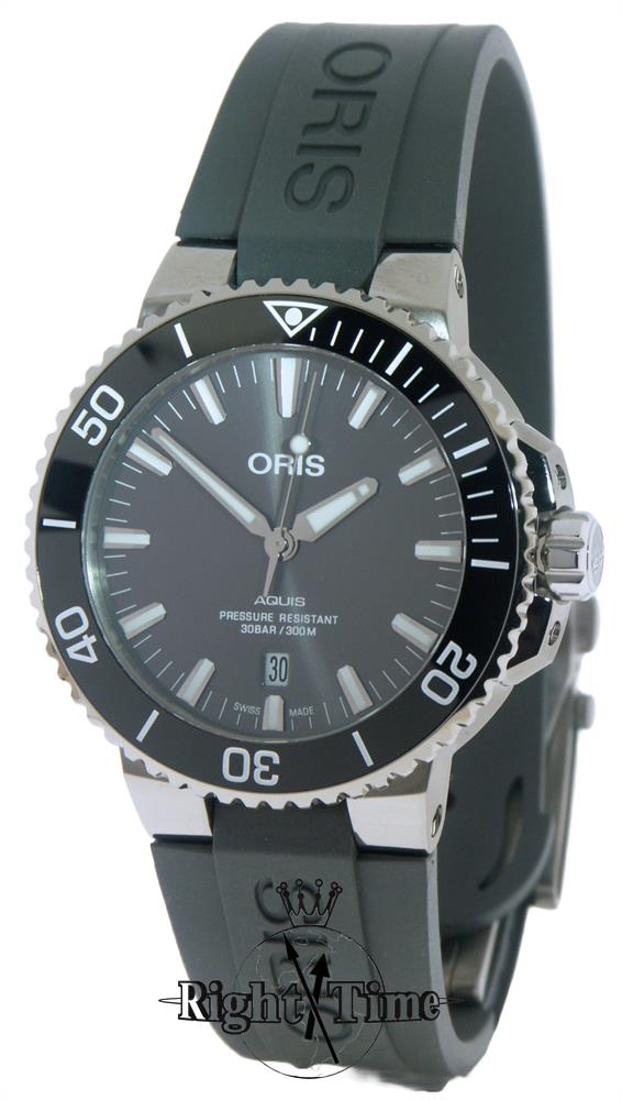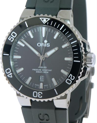 Oris Aquis Diver model 01 733 7730 7153-07 4 24 63TEB. Ultra lightweight pure titanium case with combination finish. Grey dial with luminous steel tone markers/hands. Black ceramic 60 minute rotating bezel. Swiss made Oris Caliber 733 automatic movement. Sapphire crystal. Water resistant to 300 meters. Grey genuine rubber strap with deployment buckle.