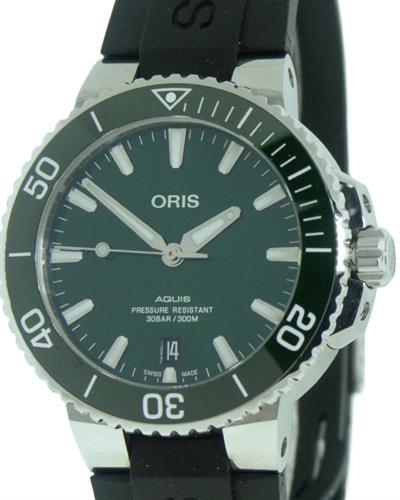 Oris Aquis Divers wrist watch. 300m Water resistant. Swiss Automatic movement, 39.5mm stainless steel case with green ceramic uni-directional 0-60 rotating bezel, screw-down crown, green polished dial with luminous hands and markers, date calendar, sapphire anti-reflective scratch-proof crystal, black rubber band on sport deployant clasp