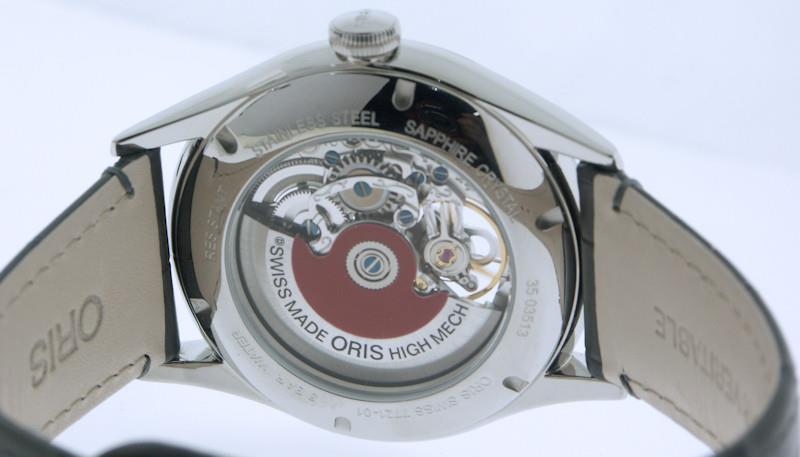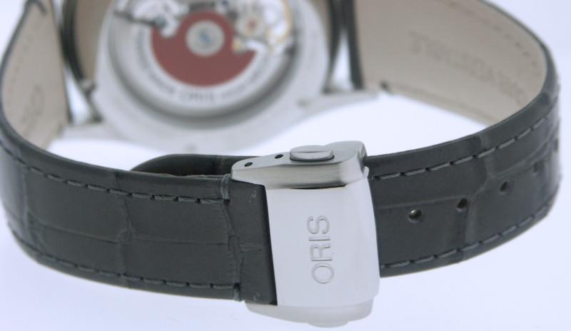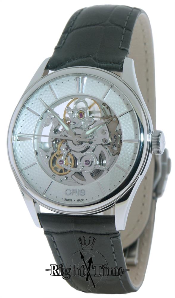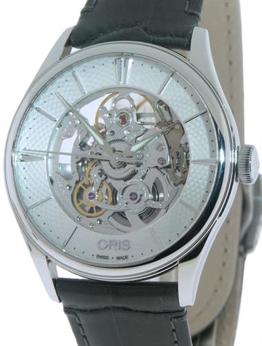 Oris Artelier skeleton model 01 734 7721 4051-07 5 21 61FC. Swiss made Oris 734 movement, fully visible thanks to the skeleton dial. Textured silver color outer dial ring with polished hour markers. Domed sapphire crystal allows for a scratch-free view of the unique dial and movement. Polished stainless steel case with a black alligator grained leather strap.