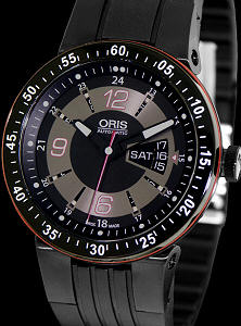 Oris Williams F-1 Team automatic 0173576344764RS watch. Black dial with see-through markers and day/3-date calendar. Black PVD steel case with red accents, 0-60 numbers on the black bezel and observation case back. Black rubber watch strap.