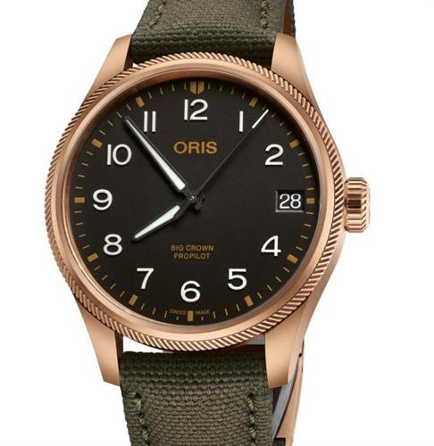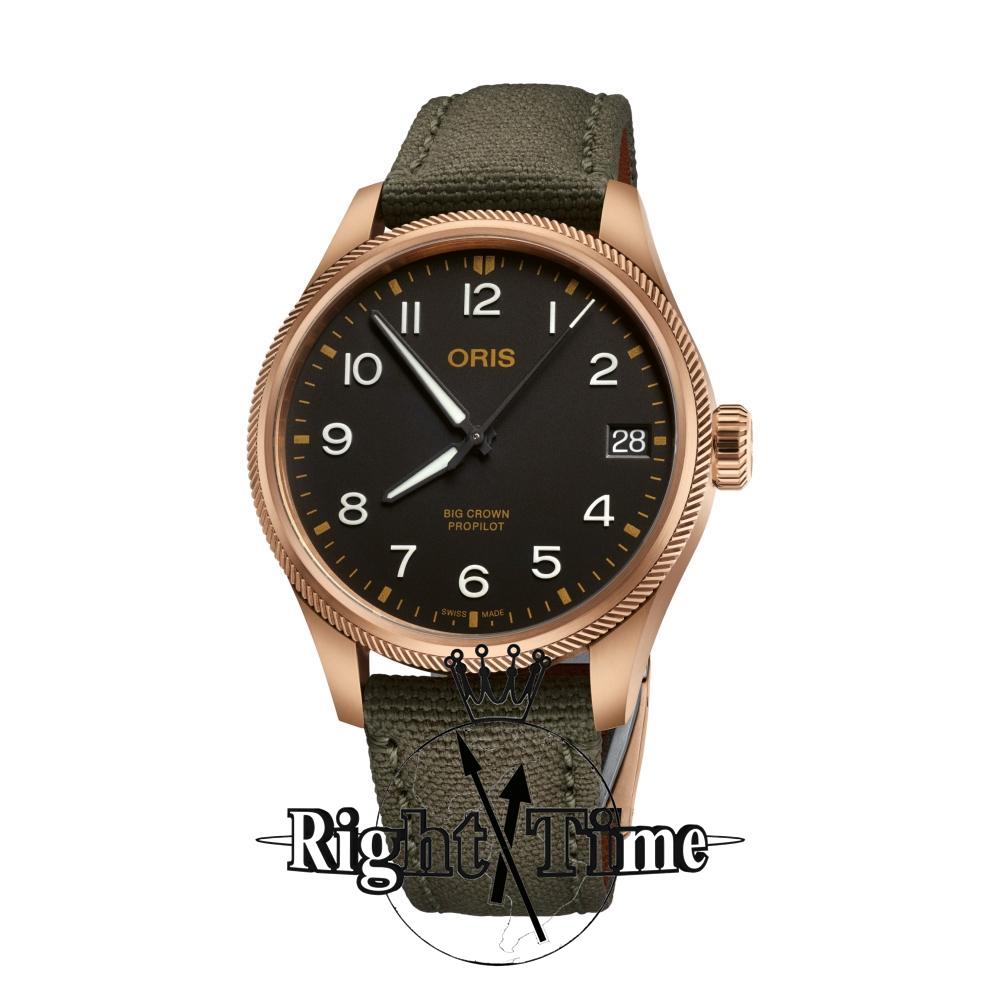Oris Big Crown series ProPilot. Swiss made Oris 751, base SW 220-1 automatic movement. Satin finished bronze case with olive green textile band. Black dial with date display window. Sapphire crystal treated with anti-glare.