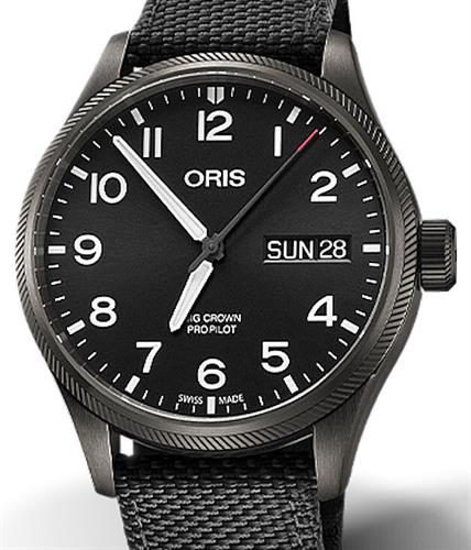 Oris Pro Pilot Big Date model 0175276984264-0752215GF. Swiss automatic movement, grey PVD stainless steel case with textile strap, black color dial with extra large day/date calendar dials, sapphire crystal.
