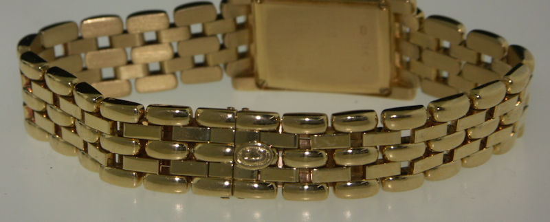 Solid 18kt Gold metal. Highly polished finish. Fits a maximum wrist size of 6.5 inches.