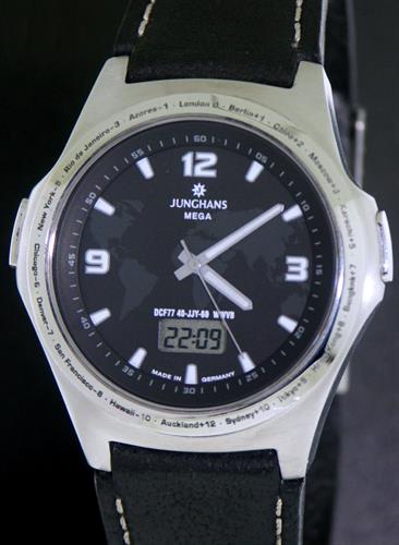 Junghans radio controlled multi-frequency reciever watch with second time zone in 30 min intervals. This model will be able to automatically recive the radio signals from 4 diffrent transmitter stations around the world.