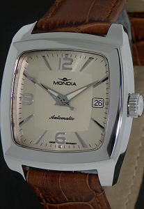 Mondia Grand Montre watch powered by ETA 2824-2 Swiss Automatic movement. Stainless steel case, sapphire crystal, champagne color dial with date calendar, leather strap