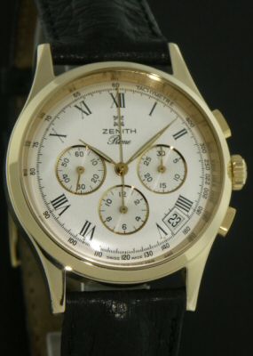 Traditional classic style, this 20 micron gold plated steel case houses famous 25 jewel Zenith "Prime" with manual wind manufactured Cal.420 that can be admired from the observation screw-down caseback.