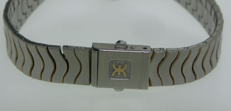 Satin finish. Solid Stainless steel. Gold electroplated accents. Watch with bracelet comfortably fits wrist size:. 6".