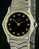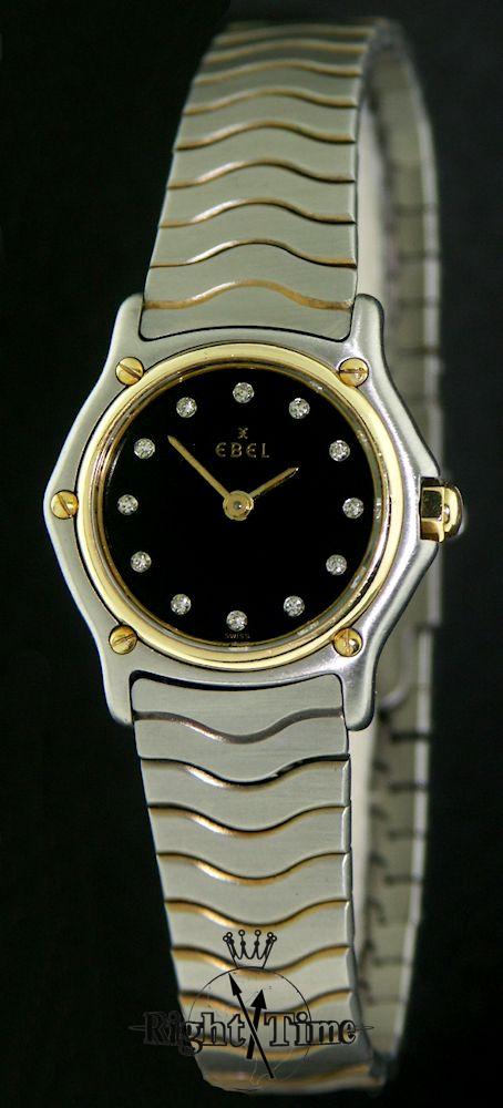 Ebel classic waive ladies quartz wrist watch with 18kt yellow gold bezel, satin finish stainless steel case and watch bracelet with gold accents, black dial with 12 diamond markers.