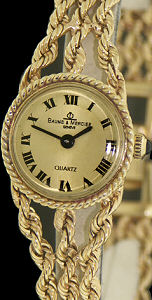 Baume and Mercier ladies watch in 14kt yellow gold case with rope style bracelet. Swiss Quartz movement. Champagne color dial