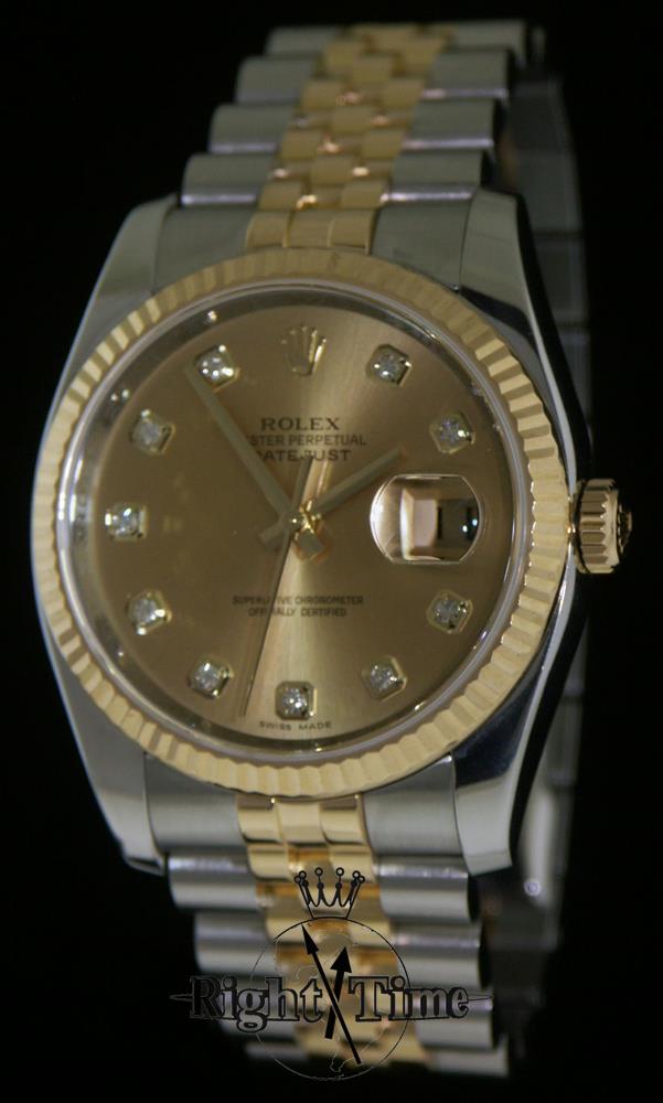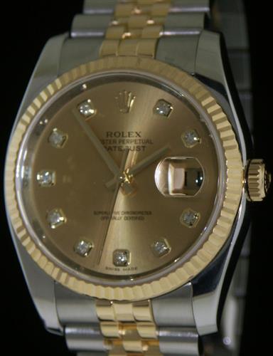 Rolex Oyster Perpetual Datejust, factory model 116233. Combination 904L stainless steel & 18kt gold case and bracelet. Rolex Calibre 3130 Automatic movement with 31 jewels, date function, and COSC certified Chronometer. Champagne colored dial with stunning diamonds seated on the polished gold tone markers which flow flawlessly with the polished gold tone hands. Raised sapphire crystal with bubble date magnifier.