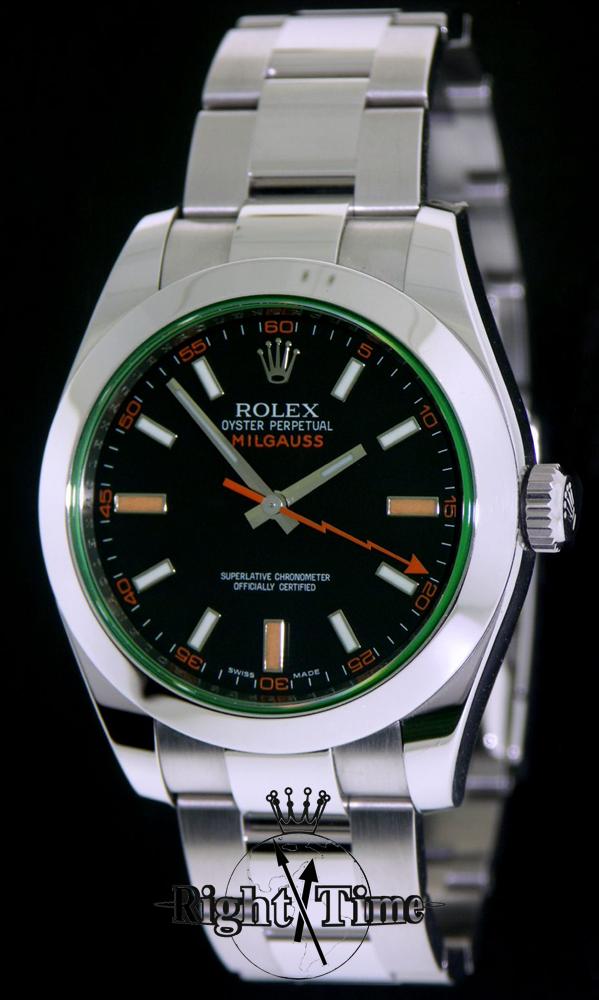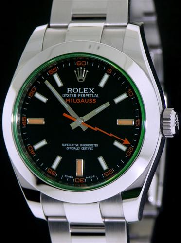 Solid stainless steel anti-magnetic Swiss made Rolex "Milgauss" model with black dial, green hue in crystal, white and orange luminous markers, original factory box and papers, 2009