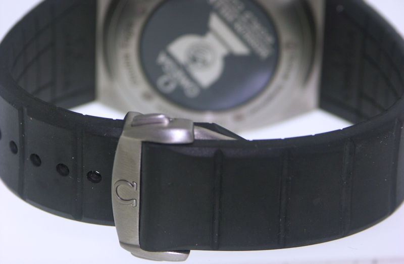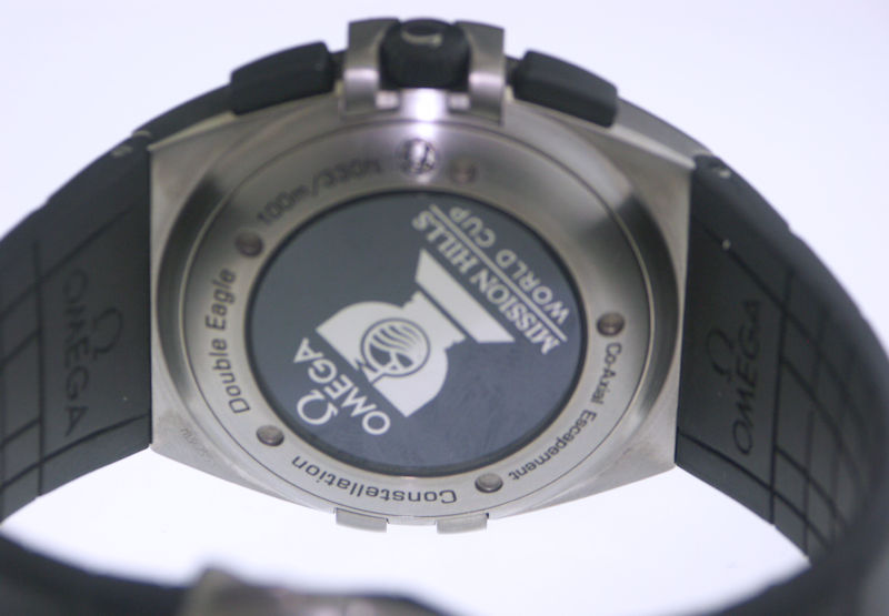 Omega Constellation Double Eagle Mission Hills World Cup edition. Omega Calibre 3313 Co-Axial chronograph automatic movement. Solid titanium case with black roman numeral engraved bezel. Carbon fiber dial. Domed, scratch-resistant sapphire crystal with anti-reflective treatment inside. Water resistant to 100 meters. Comes on a black rubber strap with push-button deployment buckle.