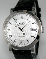 Nivrel special Anniversary Edition model. Swiss ETA Cal. 2824-2 Automatic movement with date calendar. Sterling silver Guilloche textured dial with Roman numerals. Stainless steel case with observation crystal. Limited Edition of 500 pieces.