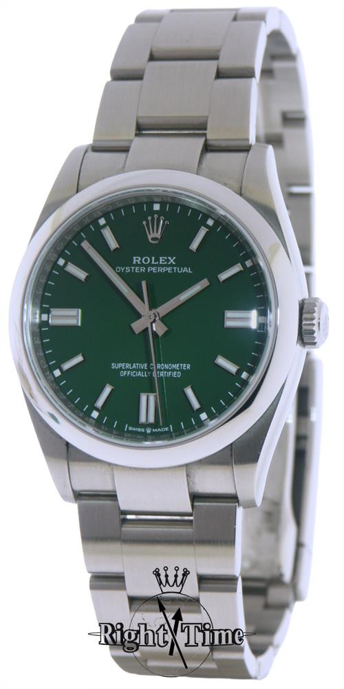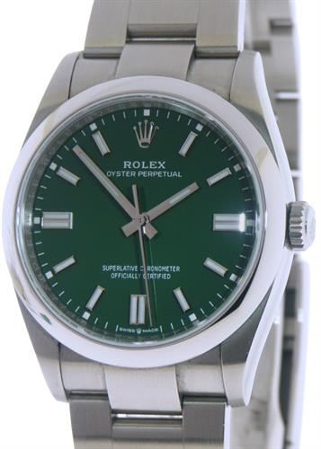 Rolex Oyster Perpetual 36, model 126000. Rolex patented 904L "Oystersteel" case & bracelet. Green dial with polished 18kt white gold luminous filled markers. Powered by the Rolex Caliber 3230 COSC certified automatic chronometer. Sapphire crystal