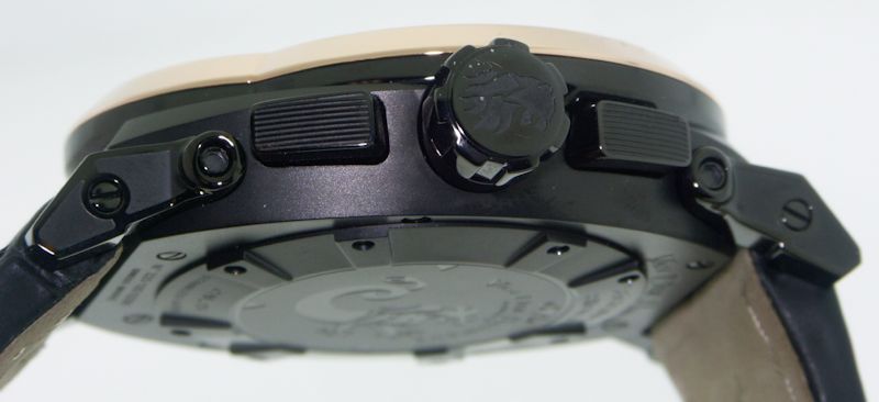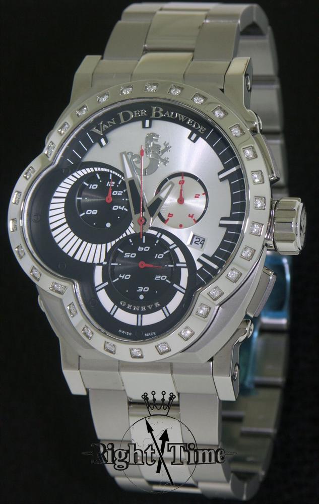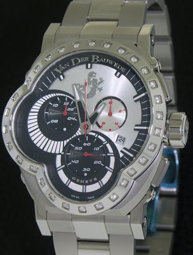 Van Der Bauwede "Legend Rider" Swiss made quartz chronograph with 30 custom set diamonds in the bezel about 3/4cttw , black and silver multi-level sculpted dial with applied steel luminous markers.