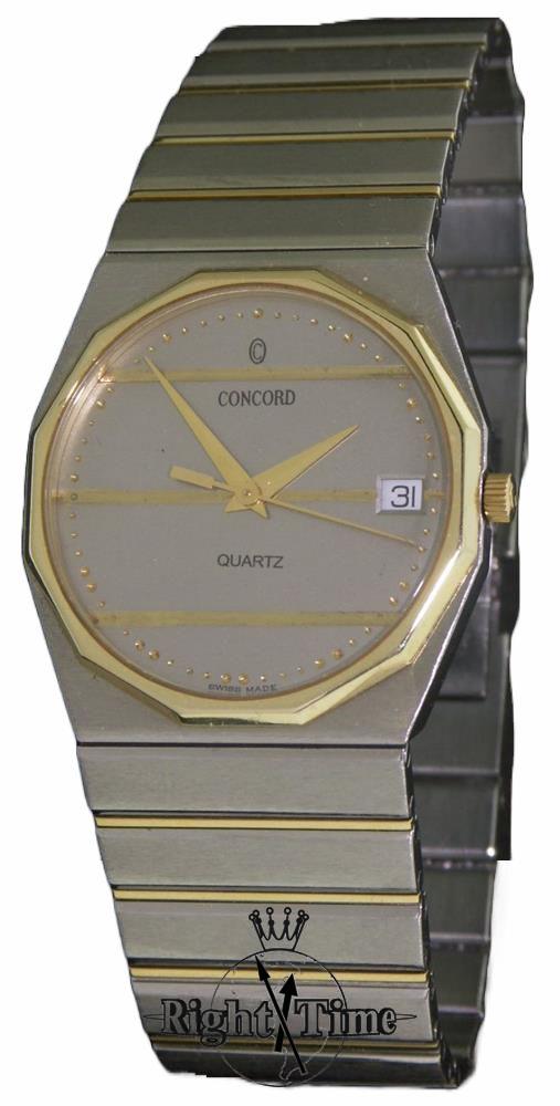 Concord Mariner SG Swiss made ultra thin quartz dress model with 18kt solid yellow gold links and bezel mixed with satin finish stainless steel.