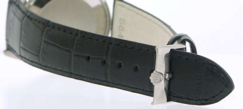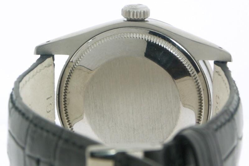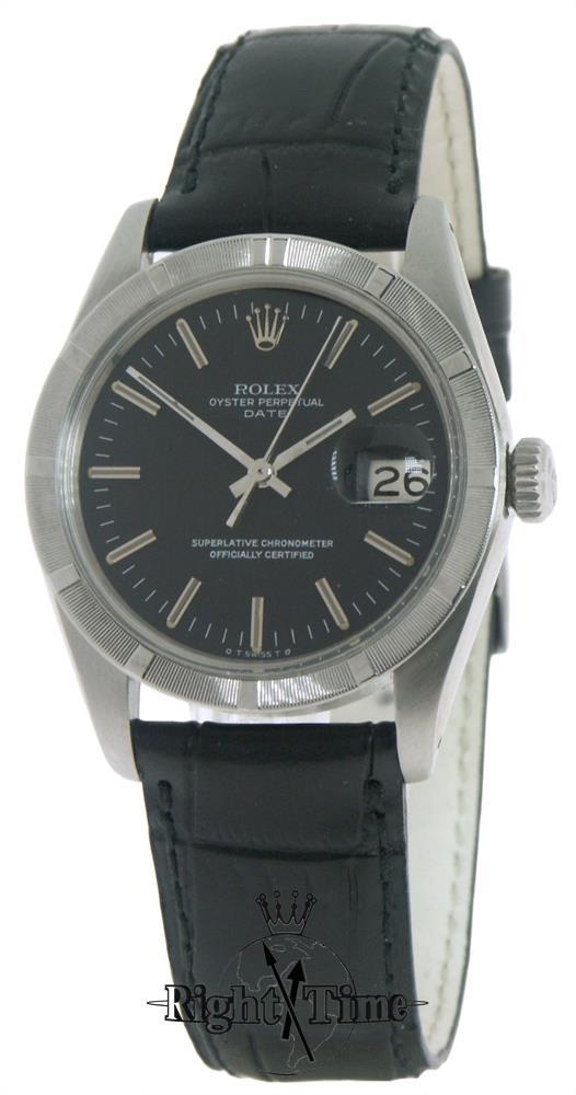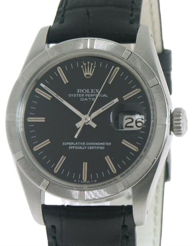 Rolex Oyster Date Perpetual model 1500. Powered by Rolex Swiss made automatic movement Cal.1570/5 with 26 jewels, certified chronometer. Fitted with engine turned bezel. Black leather strap with Rolex buckle