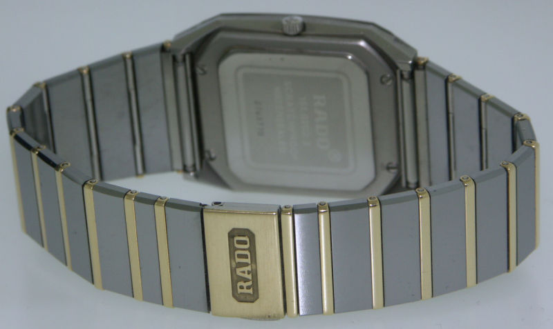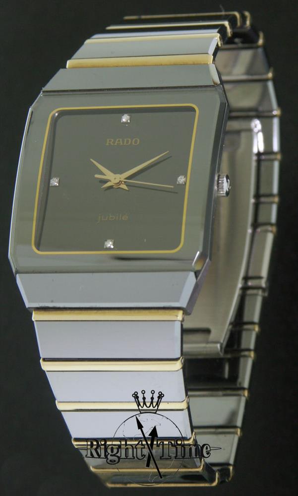 Rado Jubile Anatom collection. Quartz movement, steel case, hard metal top plates, with sapphire crystal enhanced with micro-fine vapor-deposit decorations(24 carat gold), grey dial with yellow markers, combination 14kt gold cap and satin finish steel bracelet