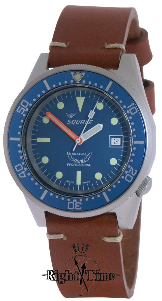 Squale Original model 1521 Super Diver 500m water resistant `Blue Ray` automatic on tan leather factory strap, powered by Sellita SW200 automatic movement,