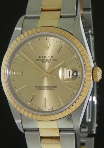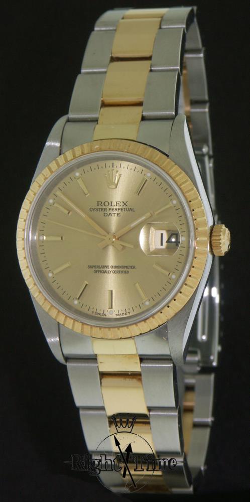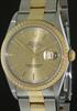 Swiss made Rolex Model 15223 Oyster Perpetual Date model 18KT yellow gold and stainless steel combination with champagne color dial and gold markers