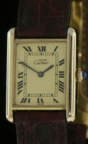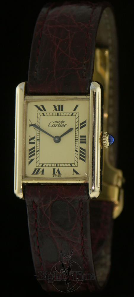 Must de Cartier "Vermeil Tank" Style, 20 micron gold electroplated case over sterling silver .925 case, 17 jewel manual wind Swiss made movement, classic champagne color dial with black Roman numbers.