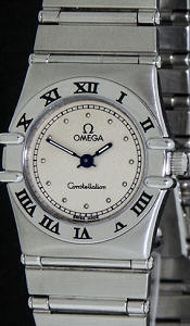 Ladies Omega Constellation Swiss made quartz model 1562.40. Stainless Steel case and bracelet, Ivory color dial, Roman numerals on polished bezel.