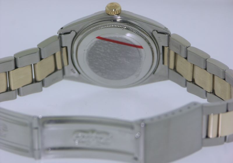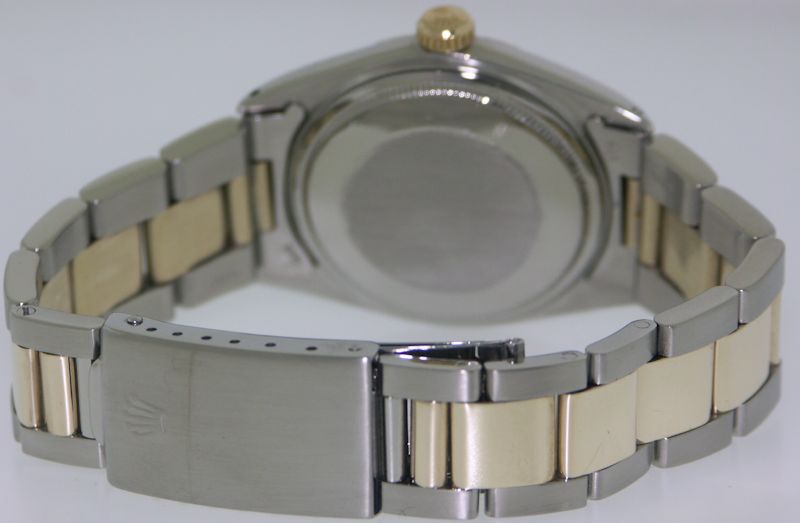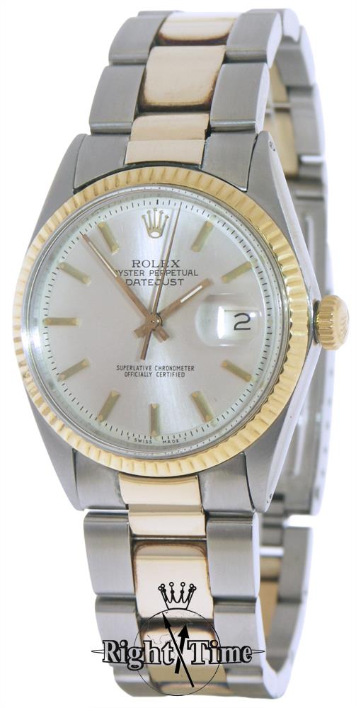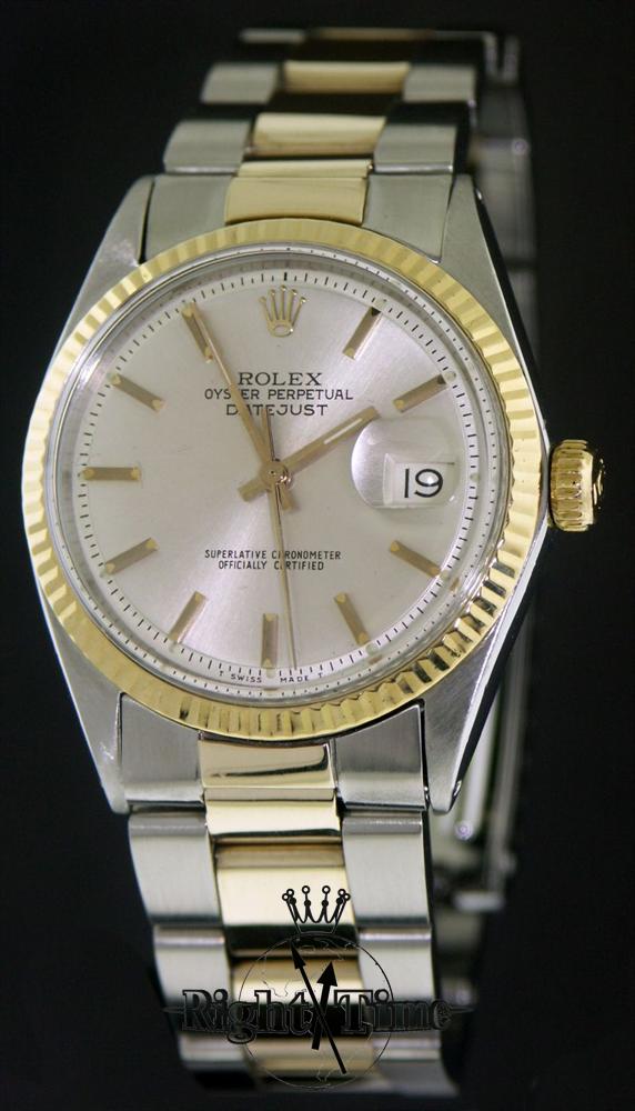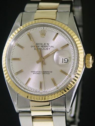 Rolex Oyster perpetual "Datejust" certified chronometer model 1601. Stainless steel case with solid gold bezel and band "oyster" style link inserts. "Pie-Pan" style silver satin dial with gold markers and hands.