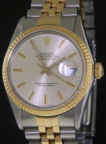 Rolex Datejust model 16013 18kt gold and steel with silver dial applied gold markers and hands, Jubilee style band, with Rolex 27 jewels automatic 3035 movement, Serial #95727**, box and papers