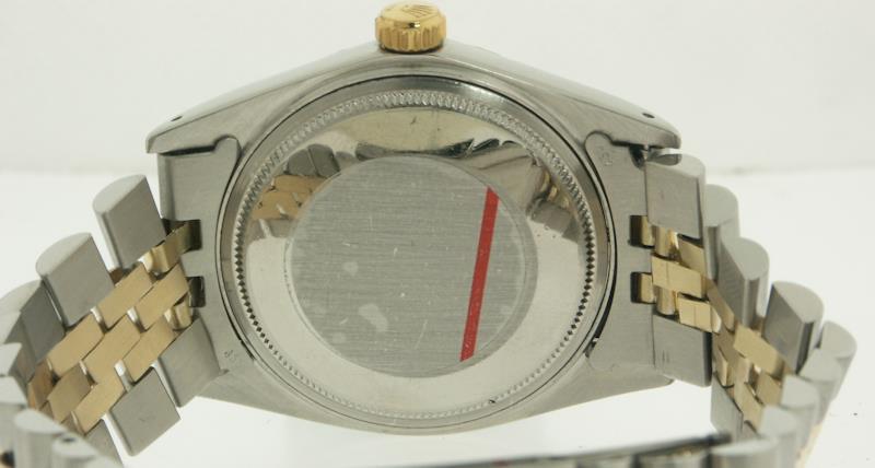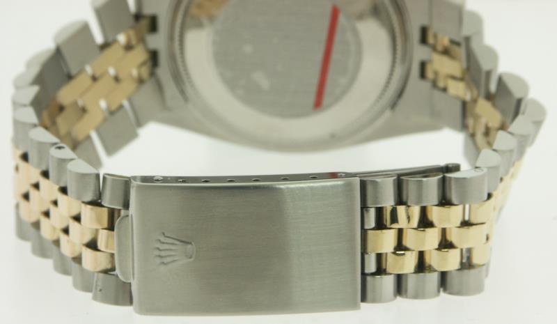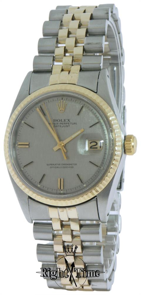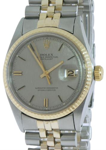 Rolex Oyster perpetual "DateJust" certified chronometer model 1601. Stainless steel case with 14kt gold bezel and band link inserts. "Pie-Pan" style silver satin dial with gold markers and hands.